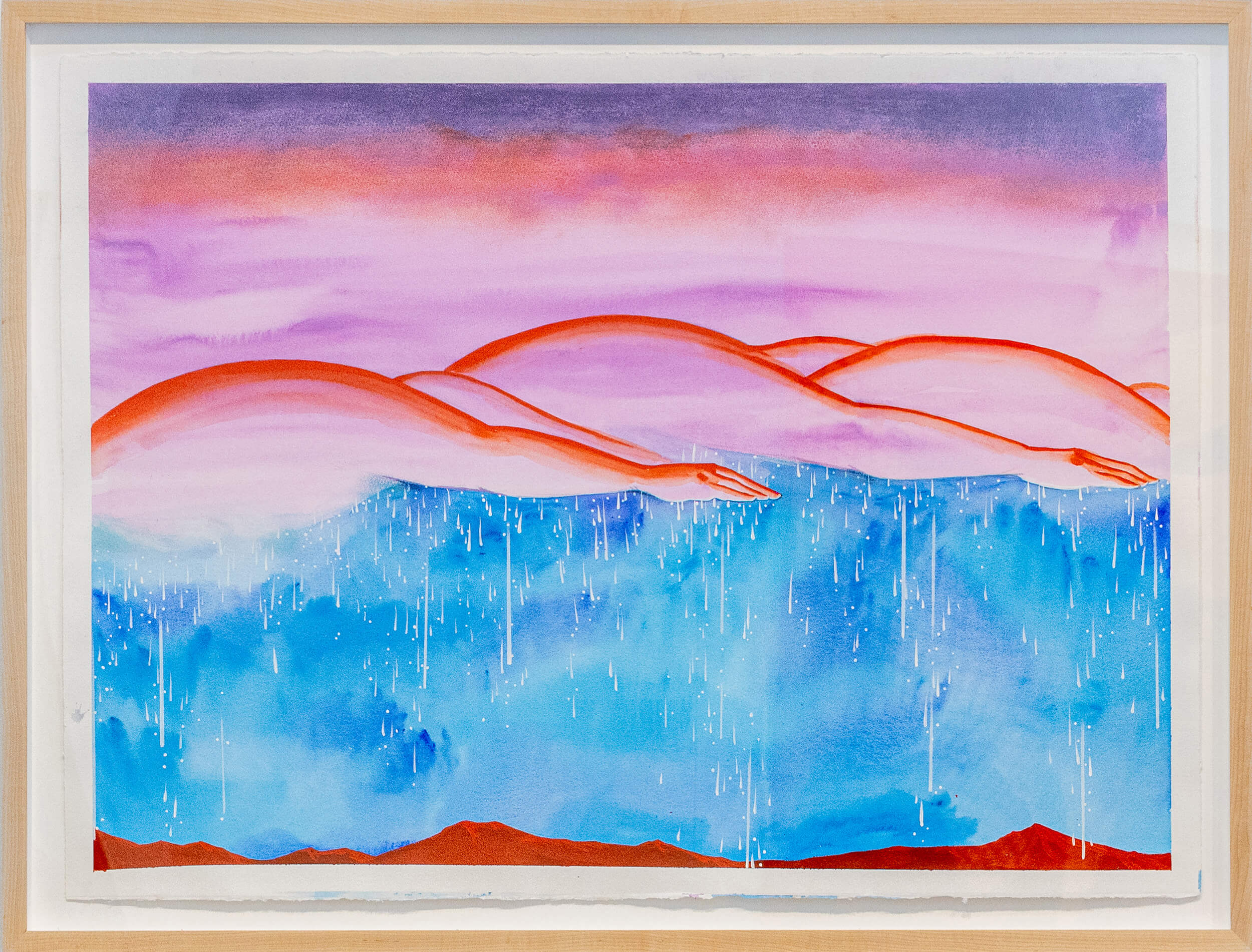 “These works expand on my interest in bringing together expressionistic, almost symbolic landscapes with geometric picture planes, arcs, and borders,” the artist told Juxtapoz about the particular element she was exploring with these pieces. “They bow, bend, and break out of borders while their feet inch into the beyond.”