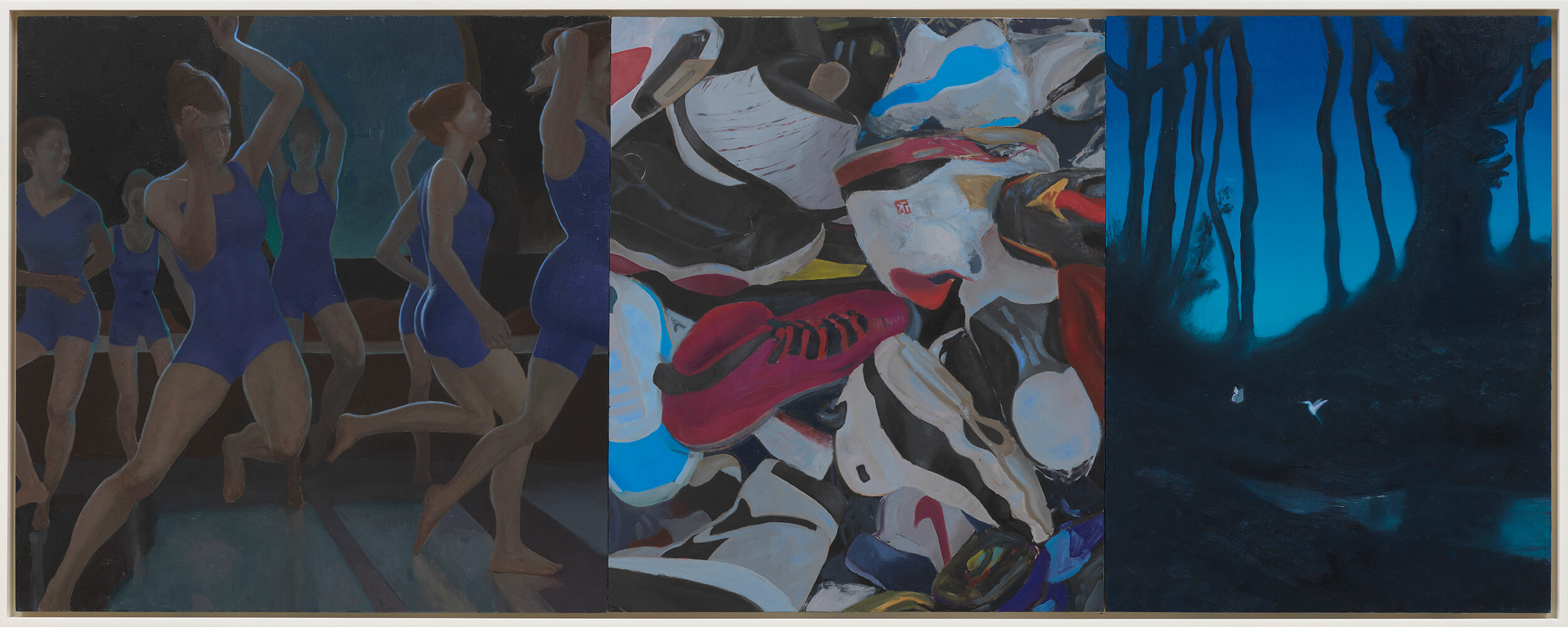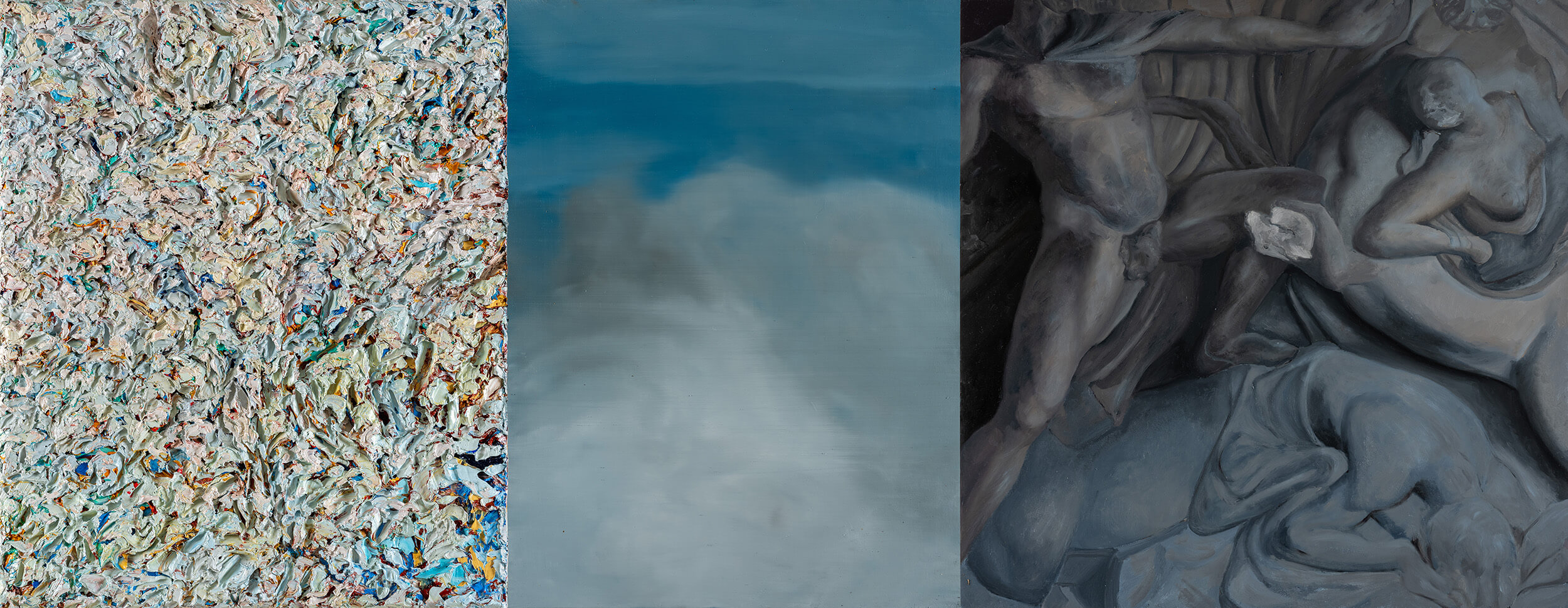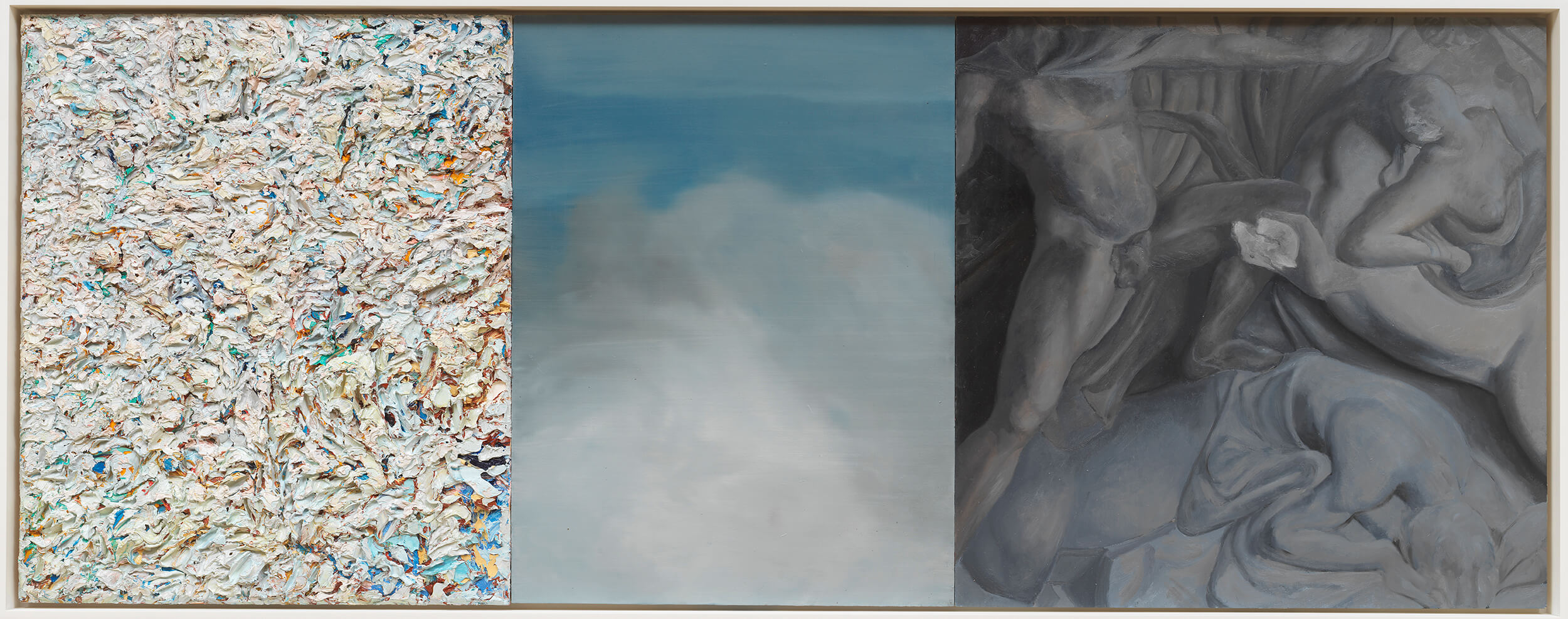 On the other side of the floor stood Alexander Berggruen’s booth, this year reserved entirely for the artist Gabriel Mills. Berggruen hosted a solo show for Mills last fall, where the best work on display consisted of massive triptychs. The canvases of each triptych in the fall show alternated between thinly painted depictions of airy subjects, such as clouds, and canvases covered in inches of thick impasto. The idea, which is to generate a balance between the lightweight and heavy elements, was interesting then, but Mills has since taken it to another level.