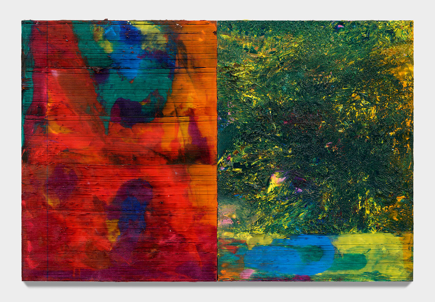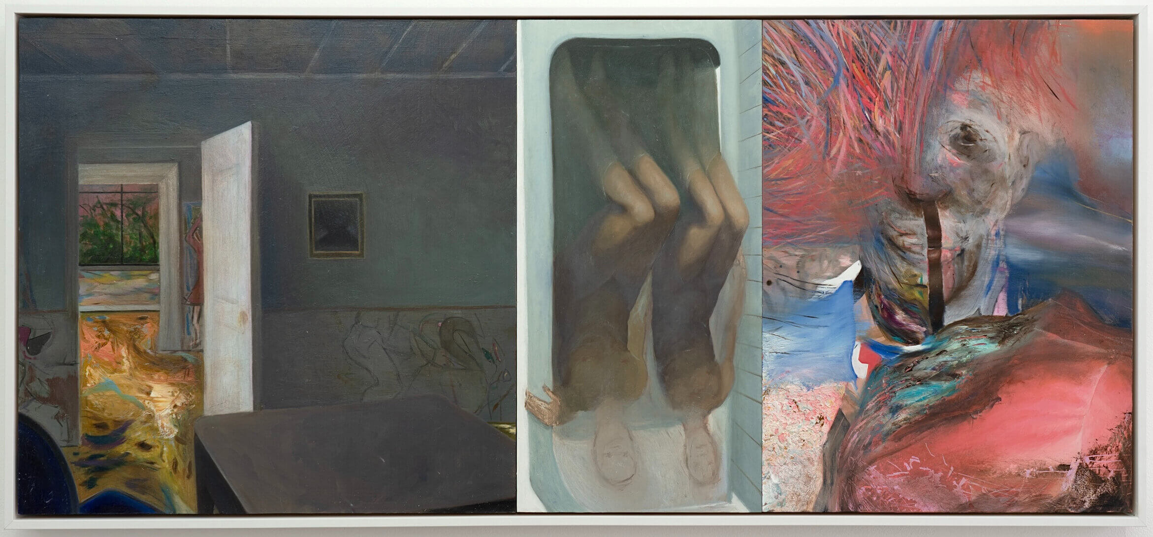 At the Armory, Mills’s Glass and the Ghost Children (2023), a massive diptych, served as the gallery’s centerpiece. It’s electric. In his prior work, Mills conjured interplay by juxtaposing heavy canvases against light ones. Now, that interaction occurs as well within each frame. Weightless currents of oil swirl and stream through their dense counterparts, the former lifting the canvas, the latter bringing it down; an equilibrium is achieved that makes the piece appear to float, suspended in midair. The smaller Ohenguai (2023) and Thira (2023) prove potent too.