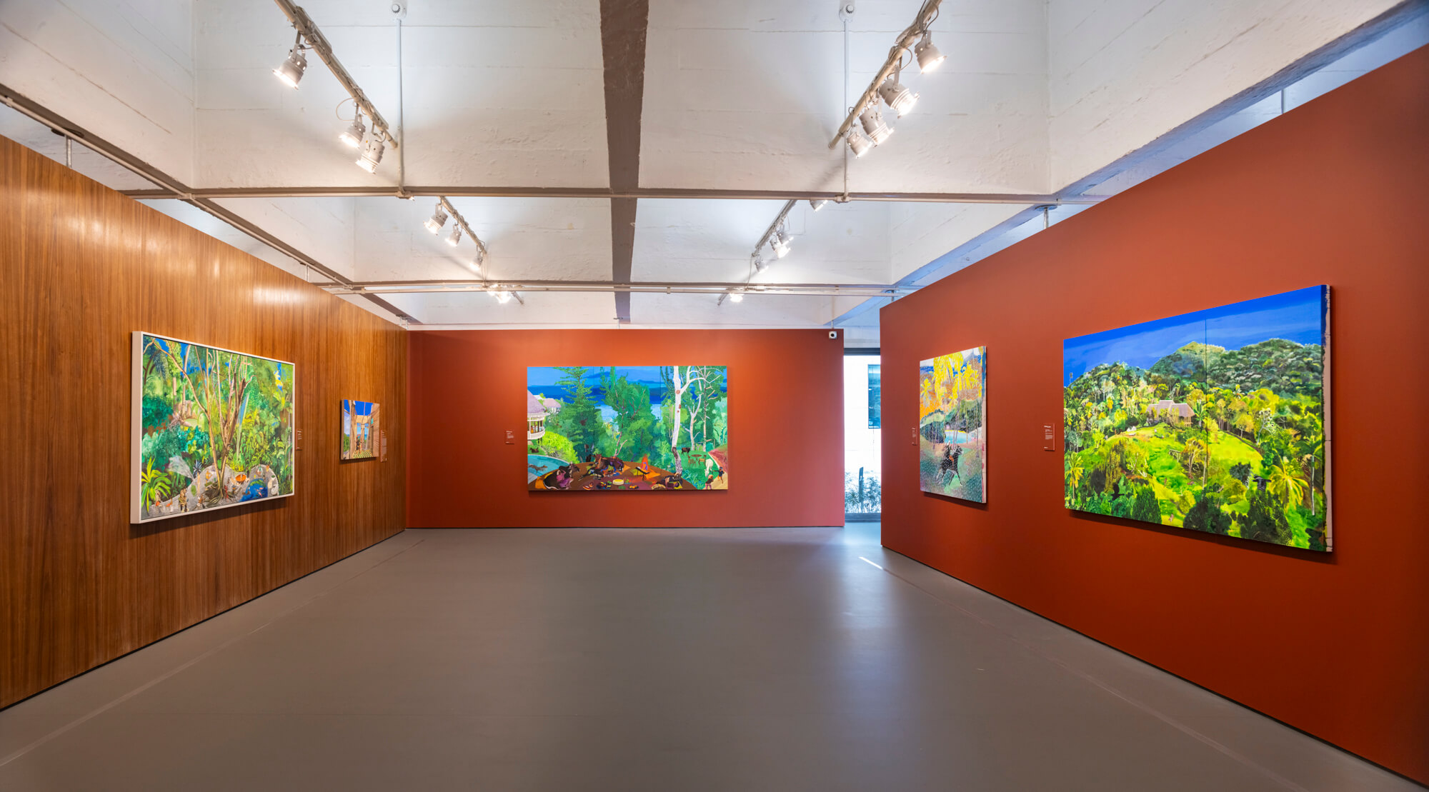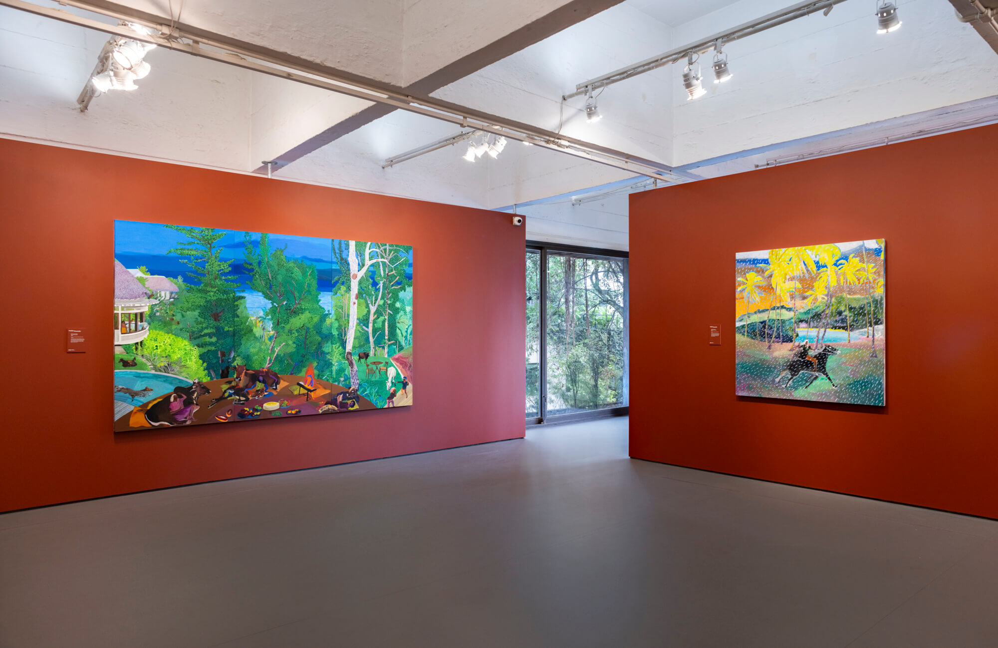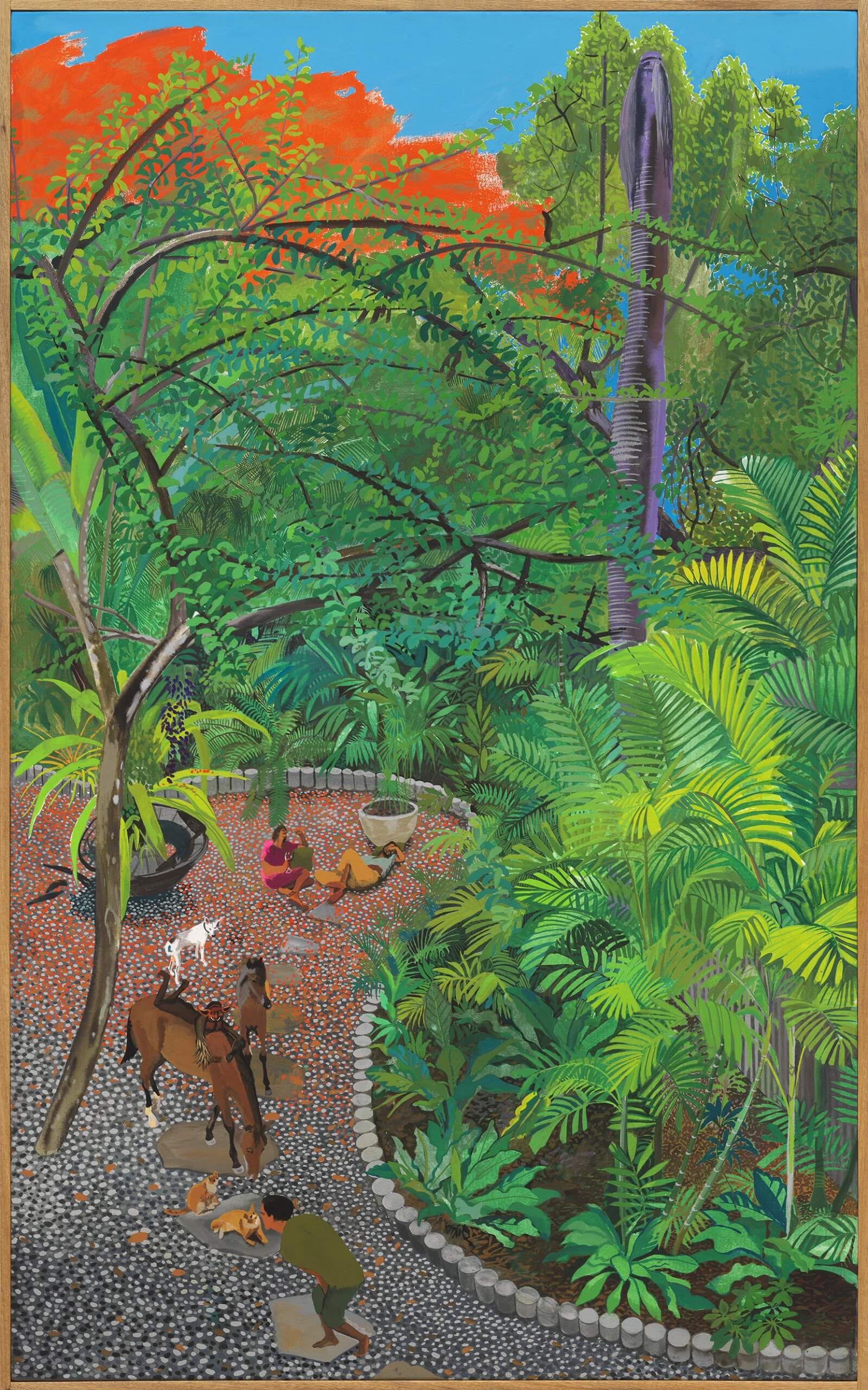 Guzmán’s solo exhibition at Alexander Berggruen is her first in the United States since [the 58th Venice Biennale], and it finds her turning, mostly, to views around her studio, where she was confined during COVID quarantine. It’s a breathtaking retreat. From the artist’s window, palm trees spread out over lush tropical hills. Garden pathways wind through forests where children, birds, and animals peer through thick trees. Guzmán’s work recalls Henri Rousseau’s in its naïve, mystical depictions of forest creatures and foliage. But her most exhilarating landscapes also make me think of Lucas Arruda, who inexplicably transforms the unyielding Brazilian Amazon into placid fields like Mark Rothko paintings. As does Arruda, Guzmán deftly invites a kind spiritual awakening in her vibrant forest scenes.