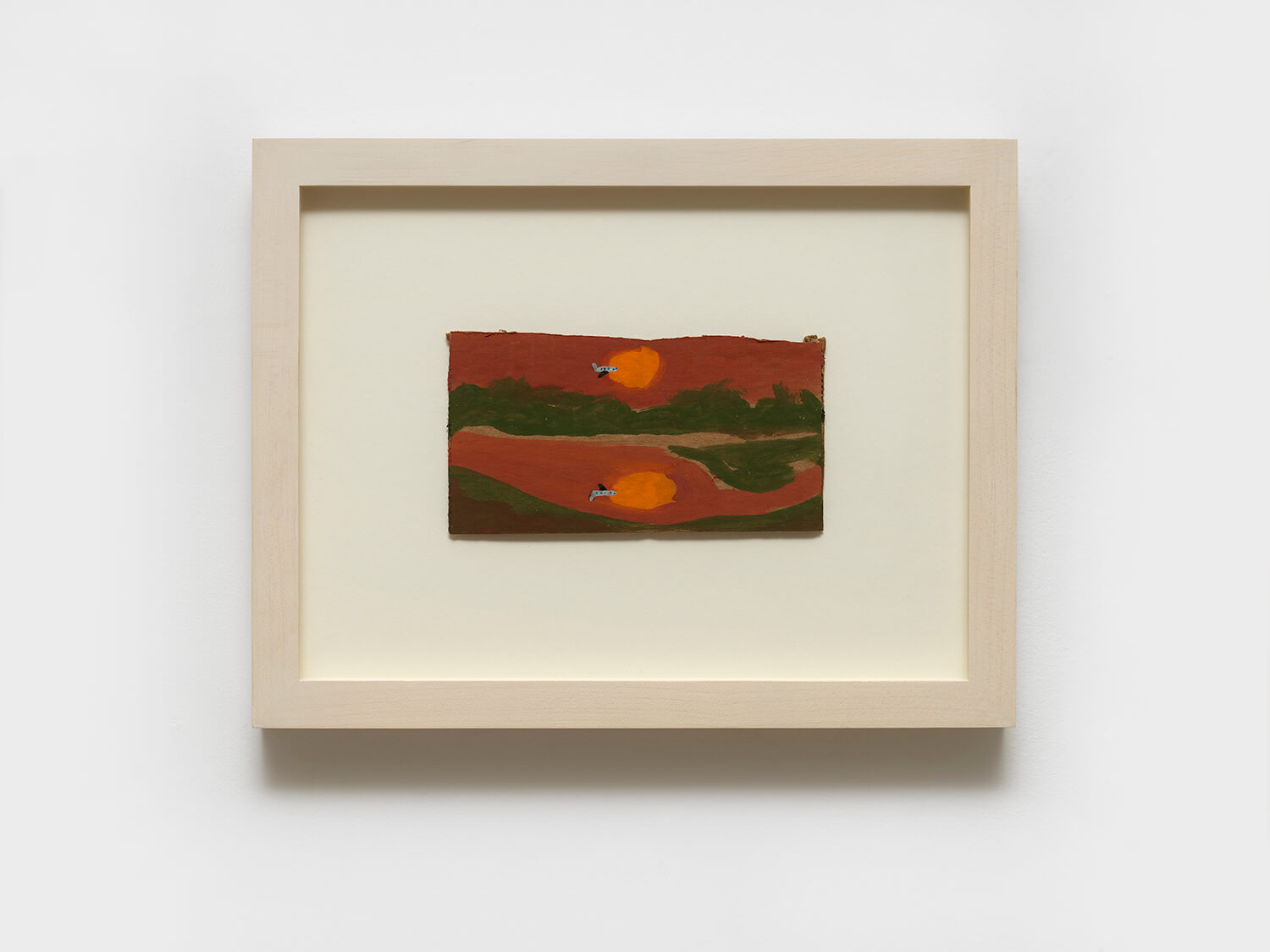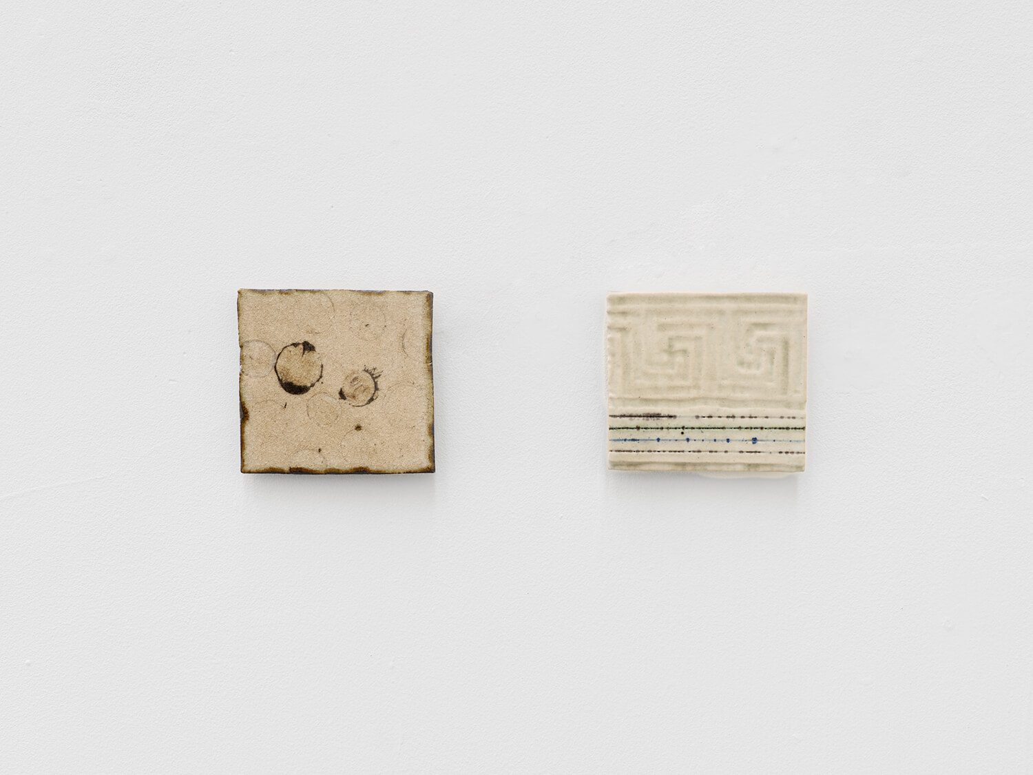 In two works, both titled “Rearview (2)” (2025–26), an empty rear-view mirror extends down from the top edge. The rest of the ceramic slabs are empty and sandy brown, as is the mirror. That emptiness suggests neither the future nor past is in sight. Being lost and baffled are recurring themes in McNamee-Tweed’s work.