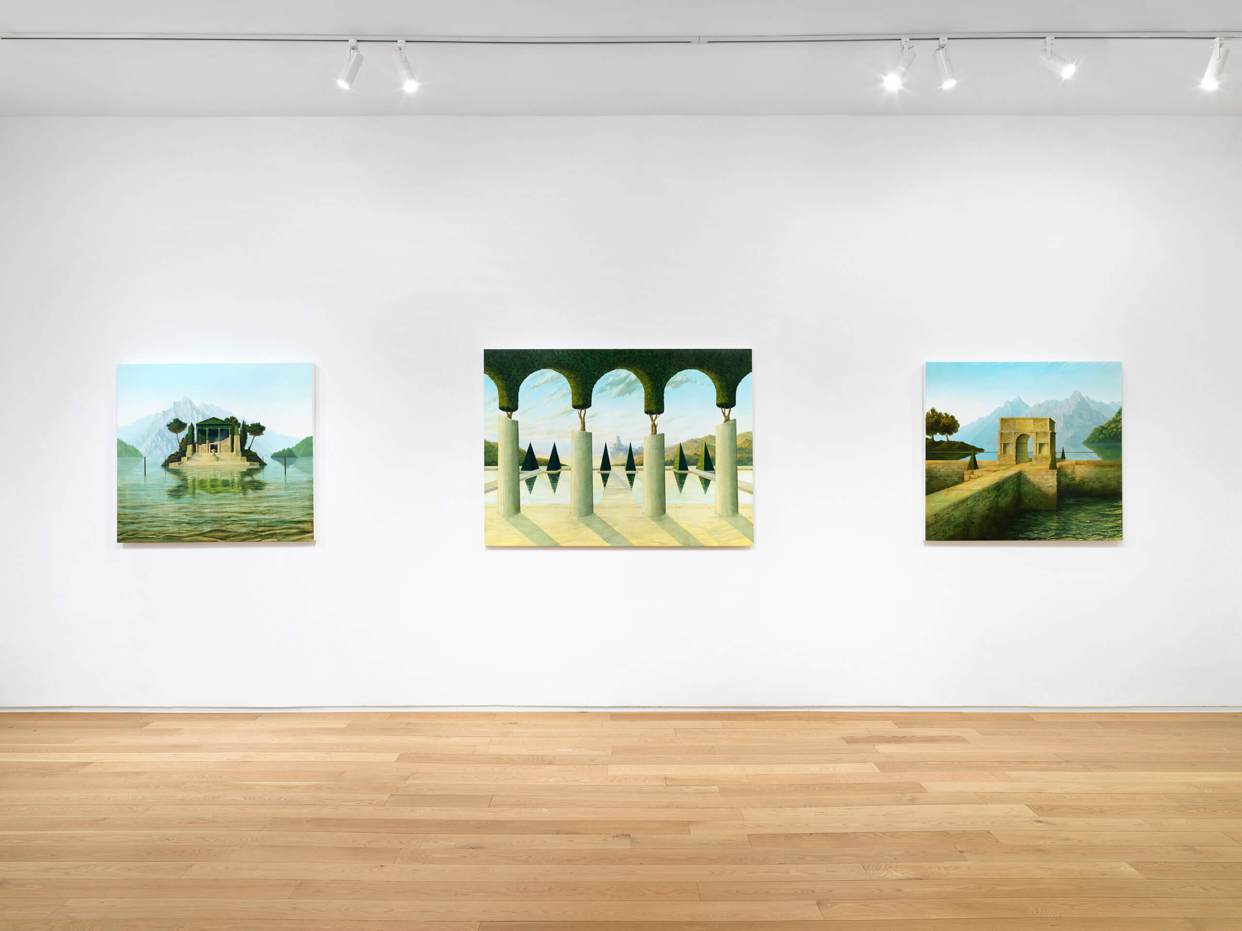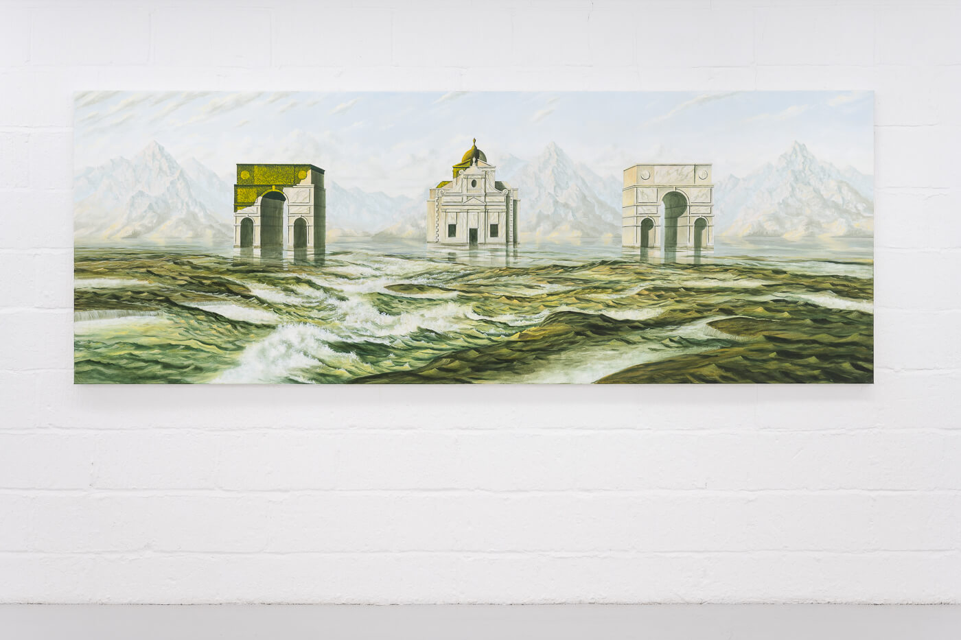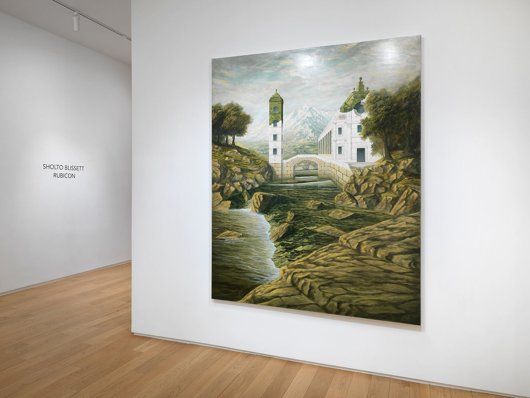 Over the past few years, British artist Sholto Blissett (b. 1996) has garnered attention with his eerie and seemingly airtight natural vistas, where mountains and lakes are interrupted by imaginary monuments—fortress-like castles, topiaries, and monuments. The scenes are disquietingly serene and pristine, with no humans to be found.