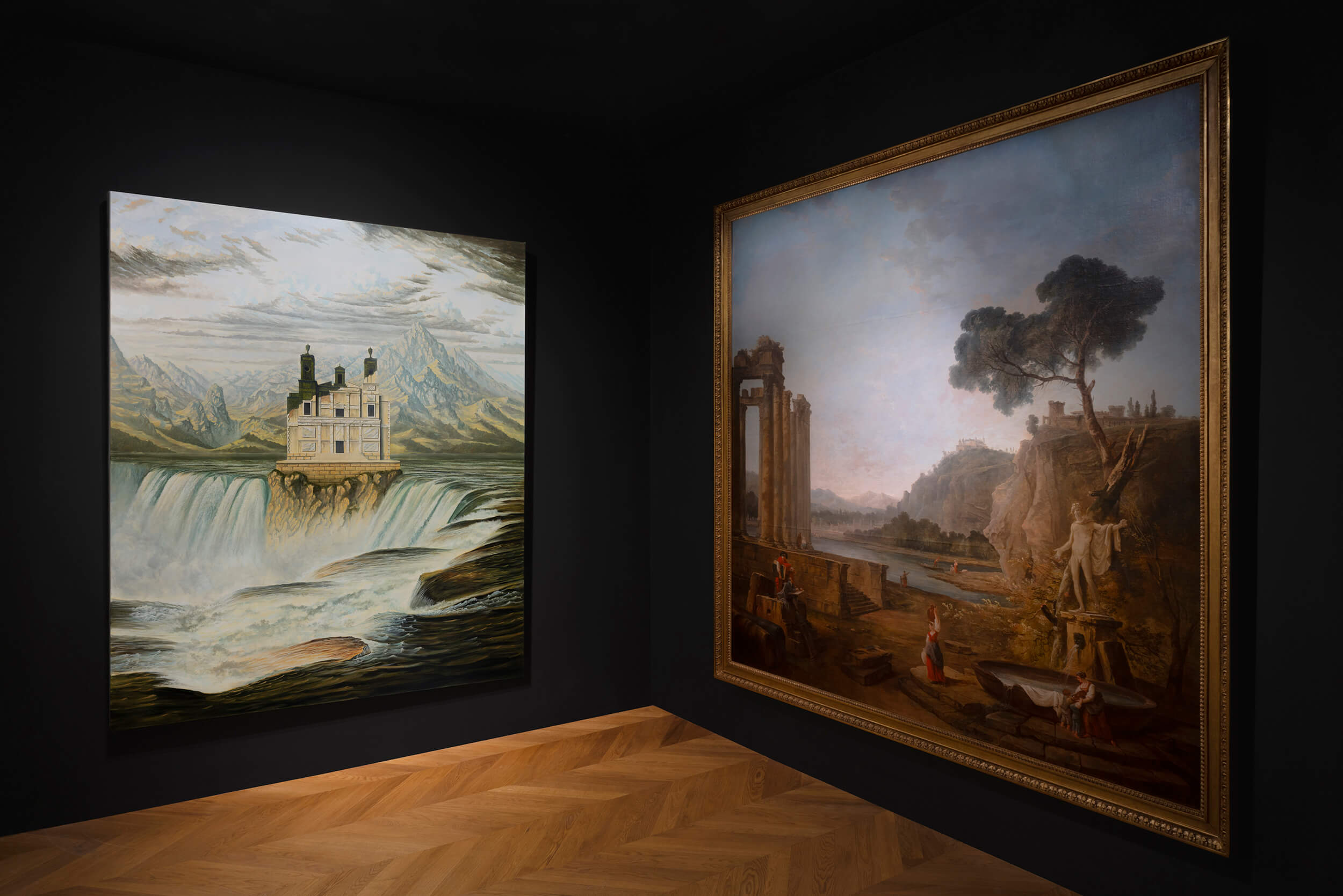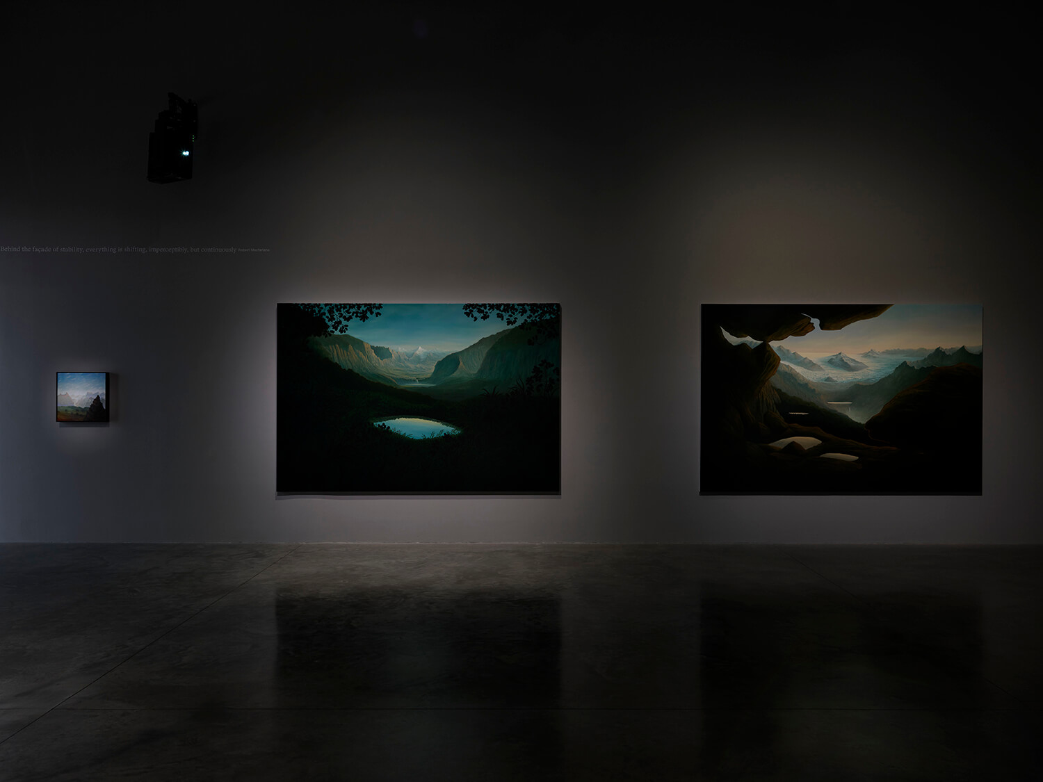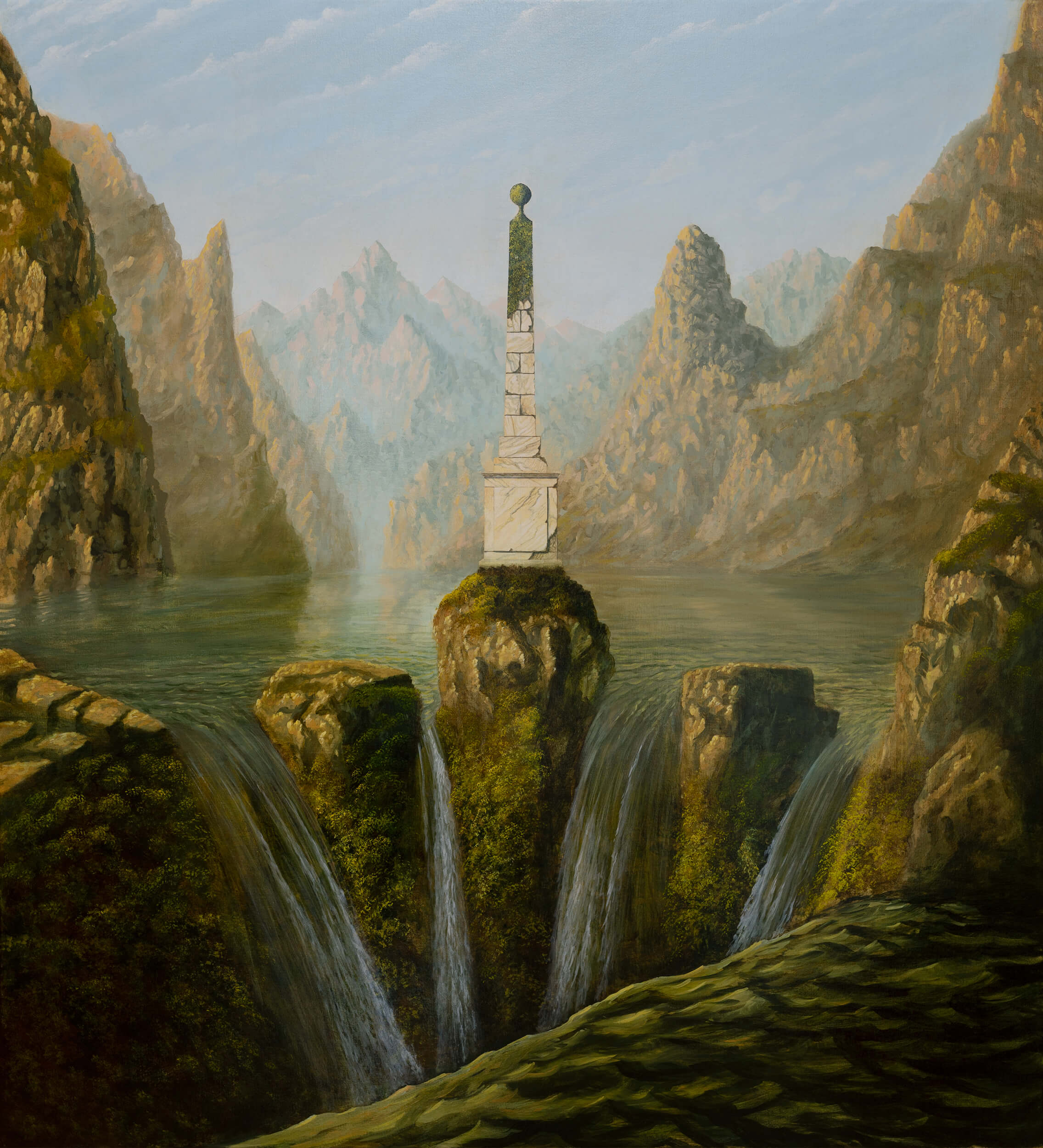 Over the past few years, British artist Sholto Blissett (b. 1996) has garnered attention with his eerie and seemingly airtight natural vistas, where mountains and lakes are interrupted by imaginary monuments—fortress-like castles, topiaries, and monuments. The scenes are disquietingly serene and pristine, with no humans to be found.
