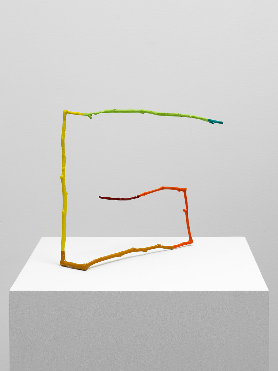 Evan Holloway’s work points to the complex natural structures that underpin reality, translated in many forms of media, primarily sculpture. The knobby rods that make up his sculpture One and Two recall the shape of twigs, while their composition gestures toward a cube. His works on paper are made by marking paper with ink while it is rotated on a turntable. The freedom this automatic procedure introduces recalls the patterns—and patterned chaos—that exist at every level of nature. Rendered in exuberant color, his work insists on the physical object as the site of an artwork’s meaning.