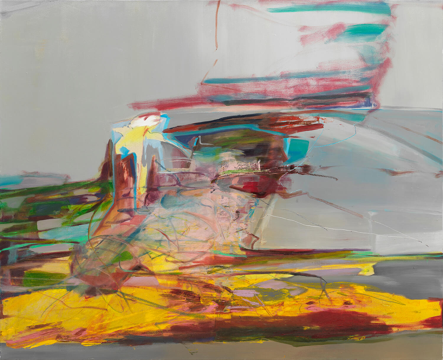 H. E. Morris paints forms and lines that at times appear to follow a structure, and at other times appear to collapse into gestural, blended veils and swarms. The artist considers her work to be a site of conflict navigation, which she thinks of in two different ways. First, she cites Cézanne’s method of working: an artist must search for “catastrophe” to start anew after the collapse of reality’s framework. Second, she encounters conflict when approaching a painting by taking on, in her words, “the role of the witness to the world,” following her own subjective interpretation. In Eclipse, for instance, painted, overlapping fabrics create a shifting surface that induces areas of blur and dynamic perceptual movement. As a viewer moves around the work, color and mark shift with the light. She explains, “The mark making provides evidence of both working with and against the color palette, suggesting where and when a conflict is arising.”