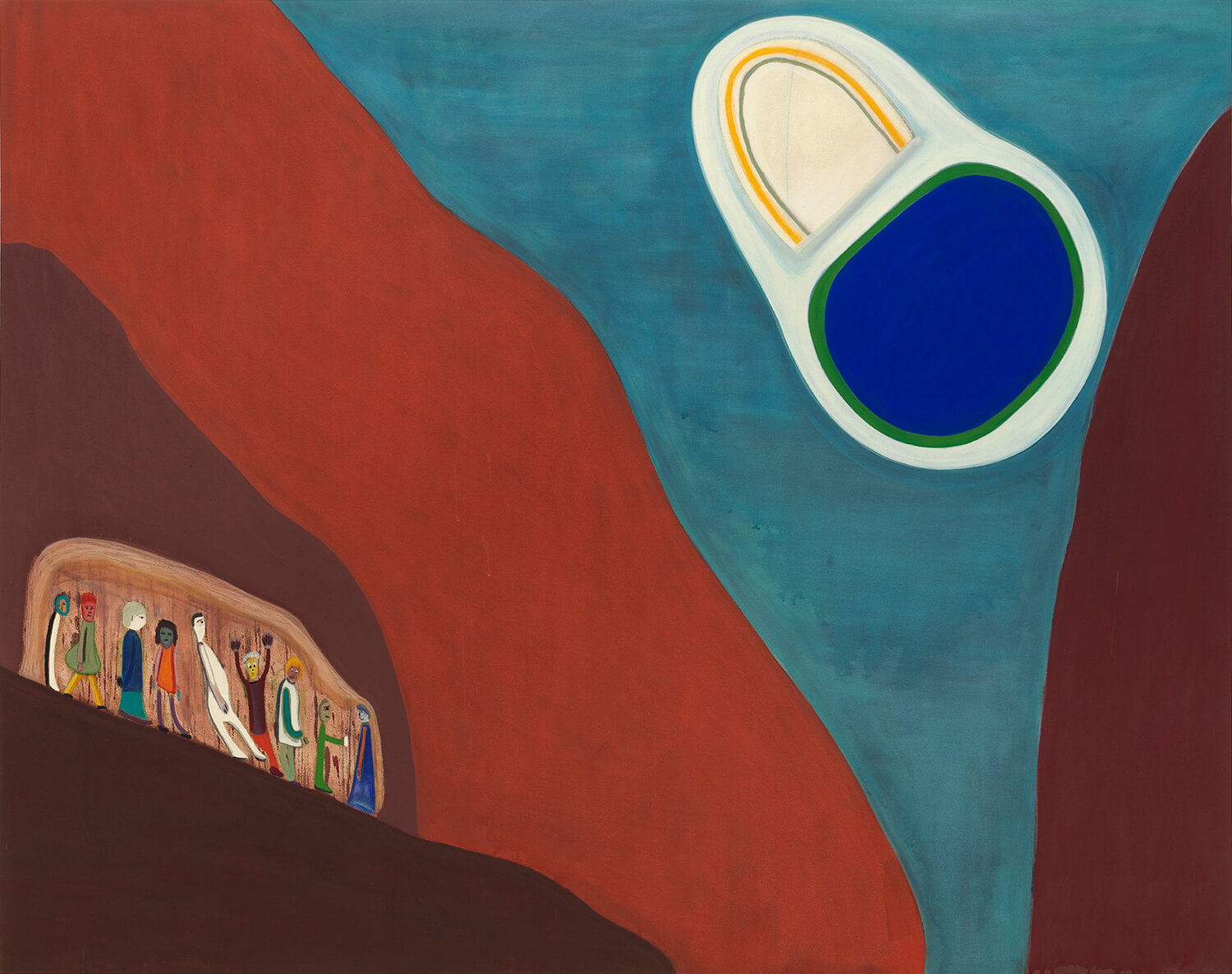 Vicente Matte’s paintings maintain their references while concentrating on their formal and psychological properties. The figure is preserved even as, in the artist’s words, he “allows the forms to go as far as possible in the search of an inexplicable adaptation.” His painting Great Conjunction depicts an astronomical event of the same name between Jupiter and Saturn that he witnessed from his home in Santiago, Chile. This abstract landscape collapses vast distances and scales into distinct geometric shapes and cross layers as a group of figures huddles in the lower left register. Pushing the forms even further, his two Untitled paintings in this exhibition retain traces of the human face despite being refined into geometry. Matte’s search for meaning exposes a precarious balance between shape and context.