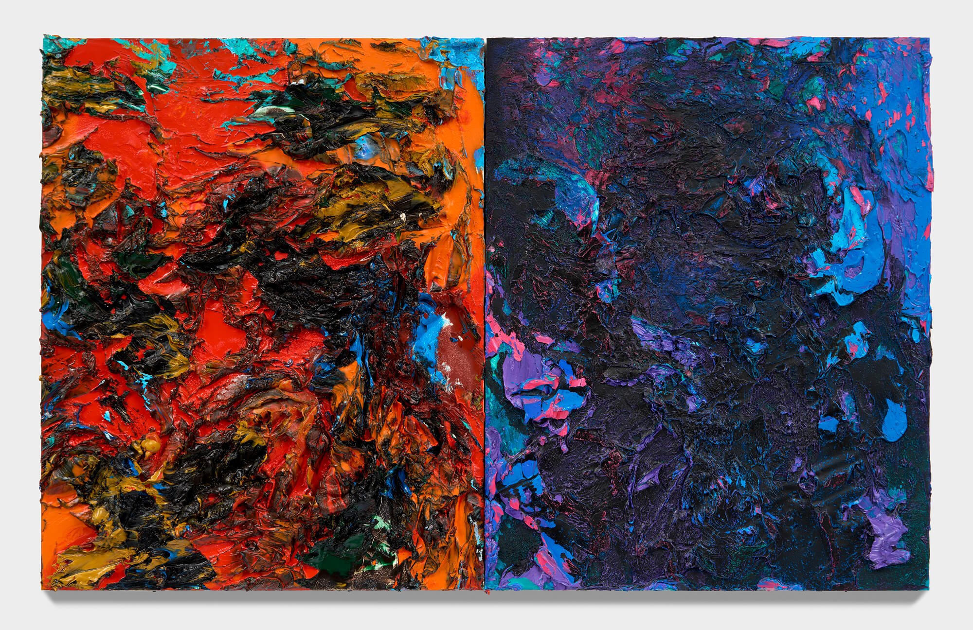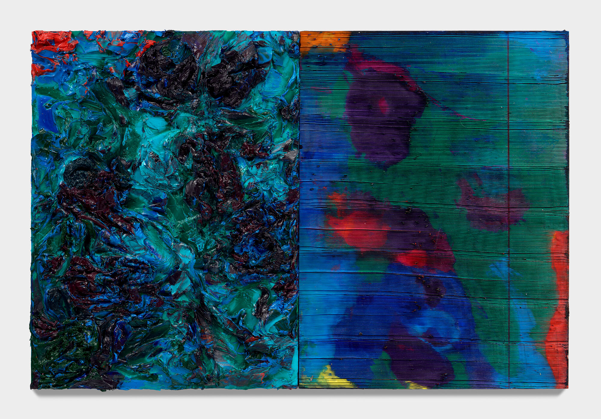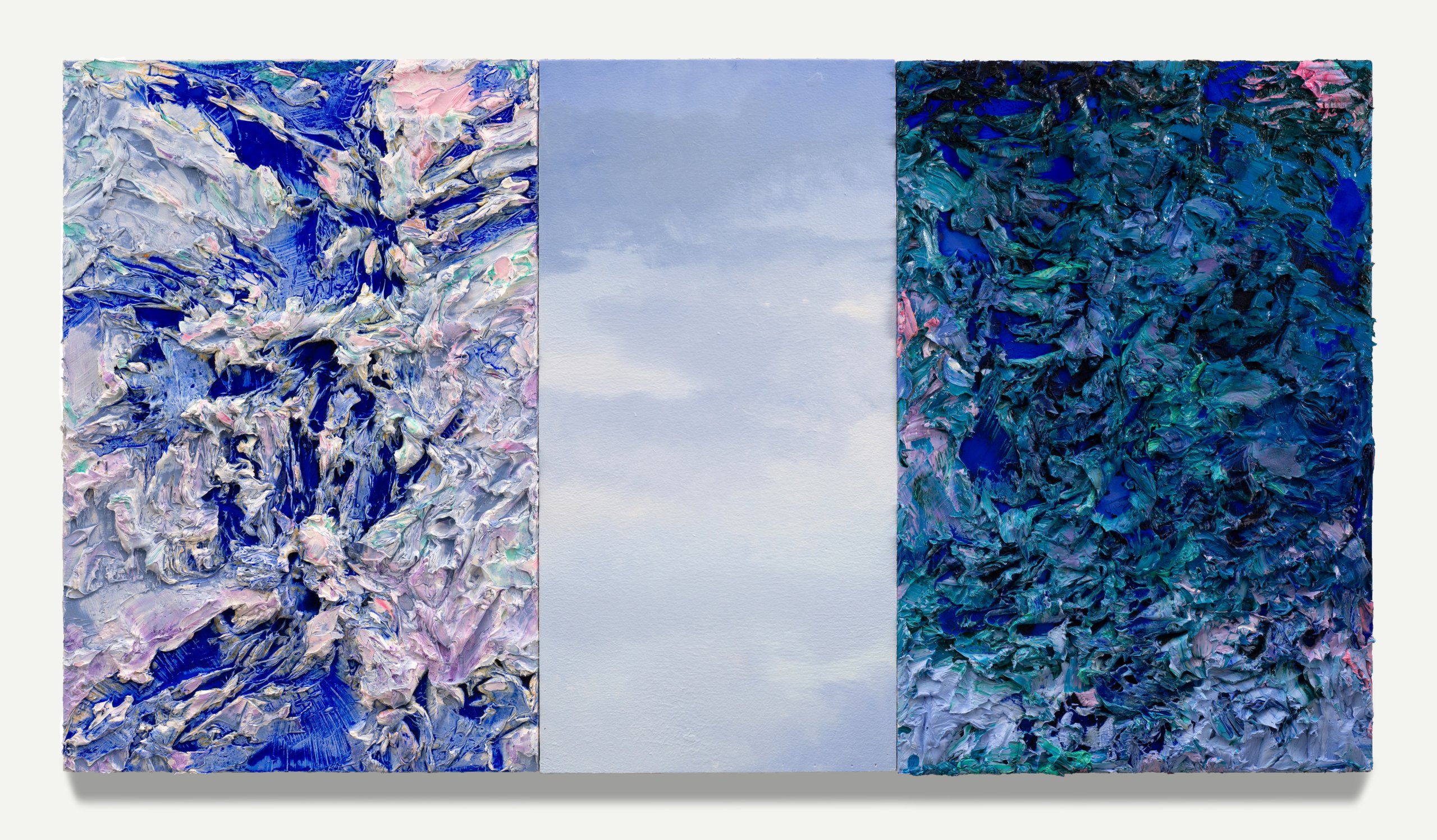 Emma Fineman, Lambda (RYB), 2026, oil, encaustic, hessian, newsprint and charcoal on linen, triptych, overall: 90 3/4 x 153 3/4 in. (230 x 390.6 cm.) each: 90 3/4 x 51 1/4 in. (230.5 x 130.2 cm.)