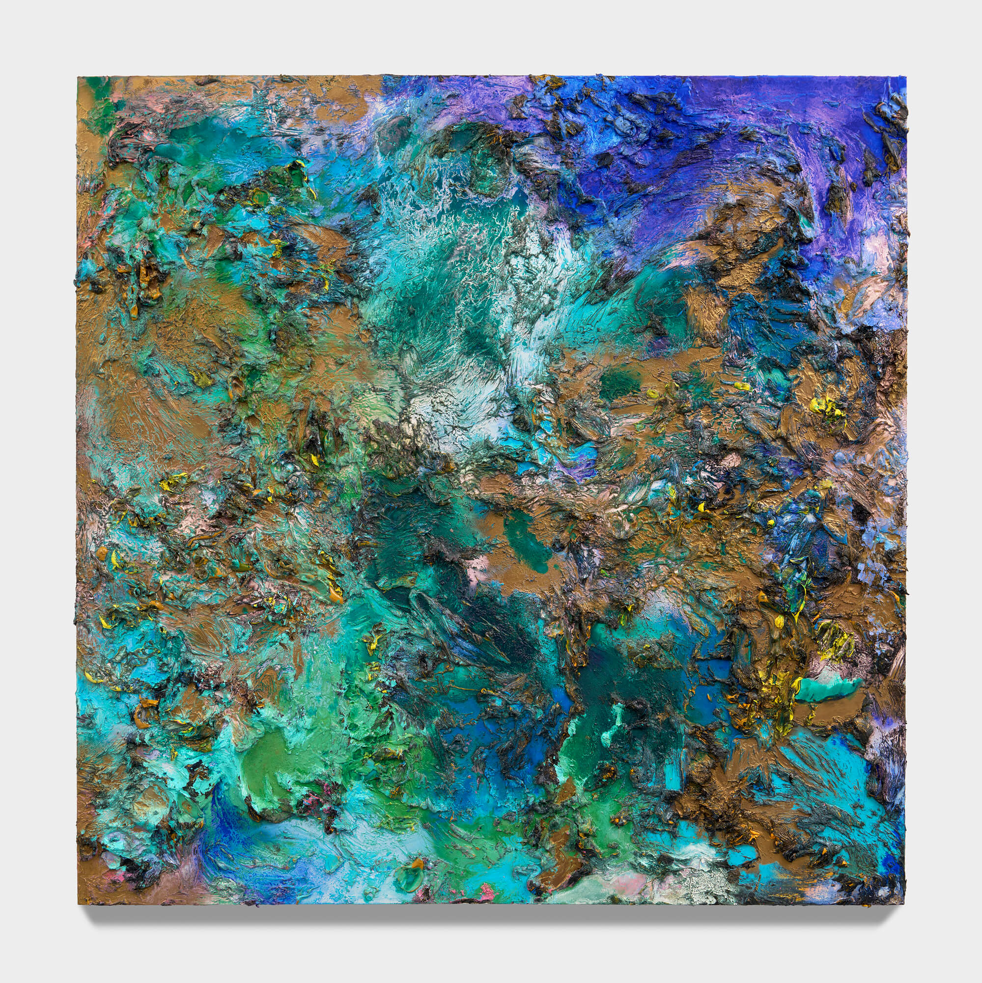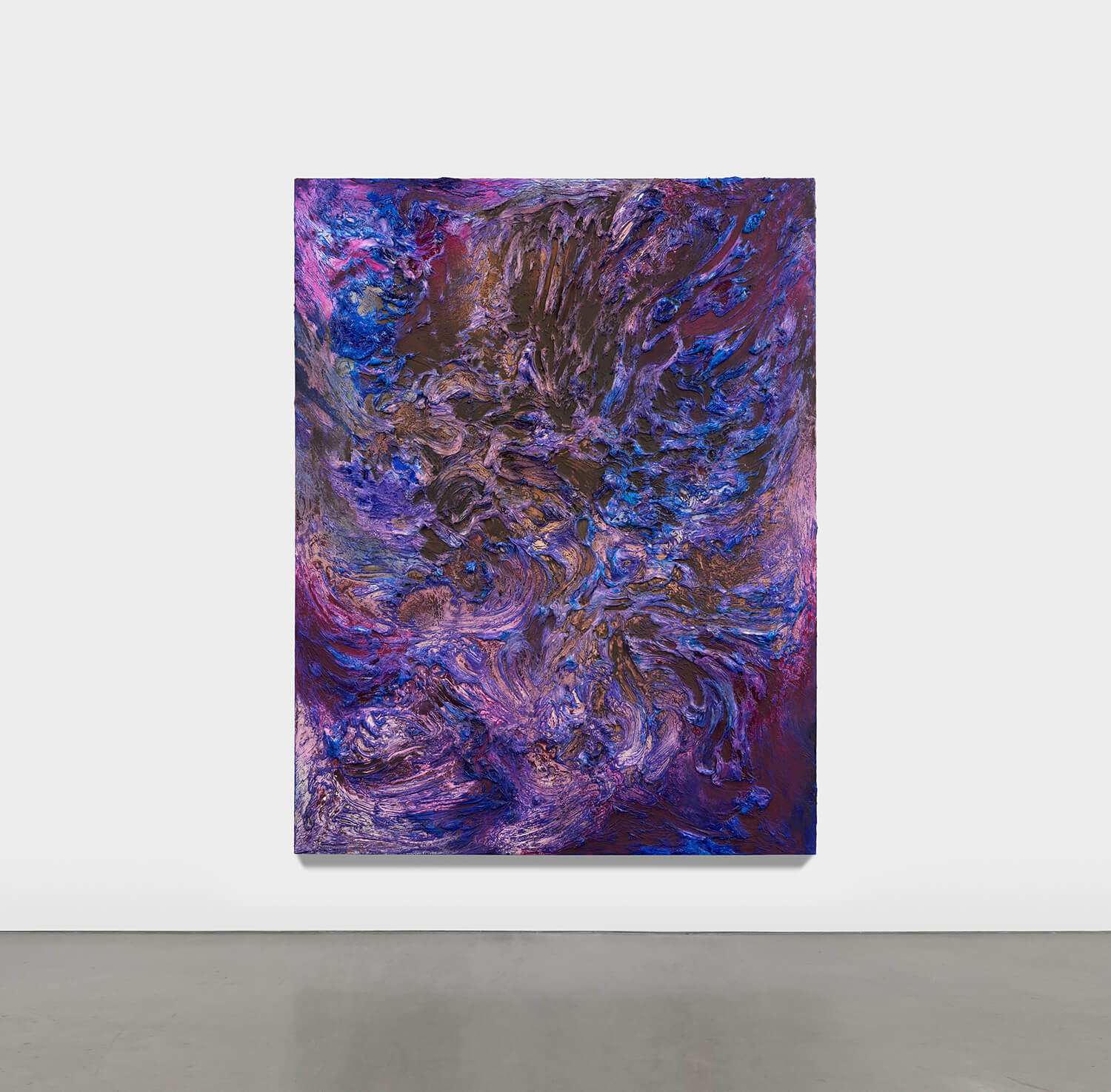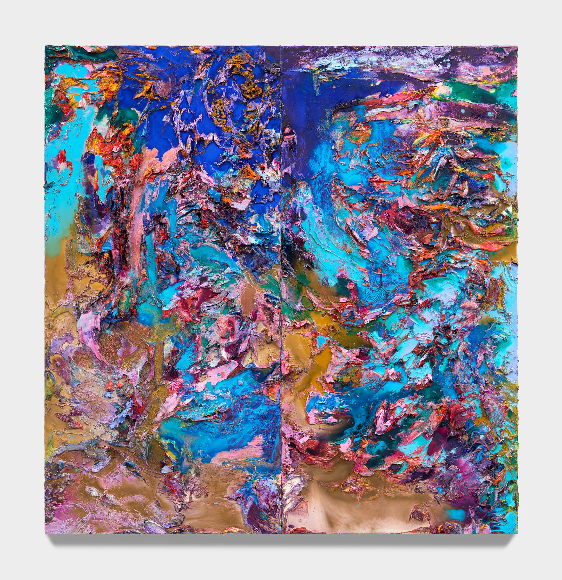 Emma Fineman, Lambda (RYB), 2026, oil, encaustic, hessian, newsprint and charcoal on linen, triptych, overall: 90 3/4 x 153 3/4 in. (230 x 390.6 cm.) each: 90 3/4 x 51 1/4 in. (230.5 x 130.2 cm.)