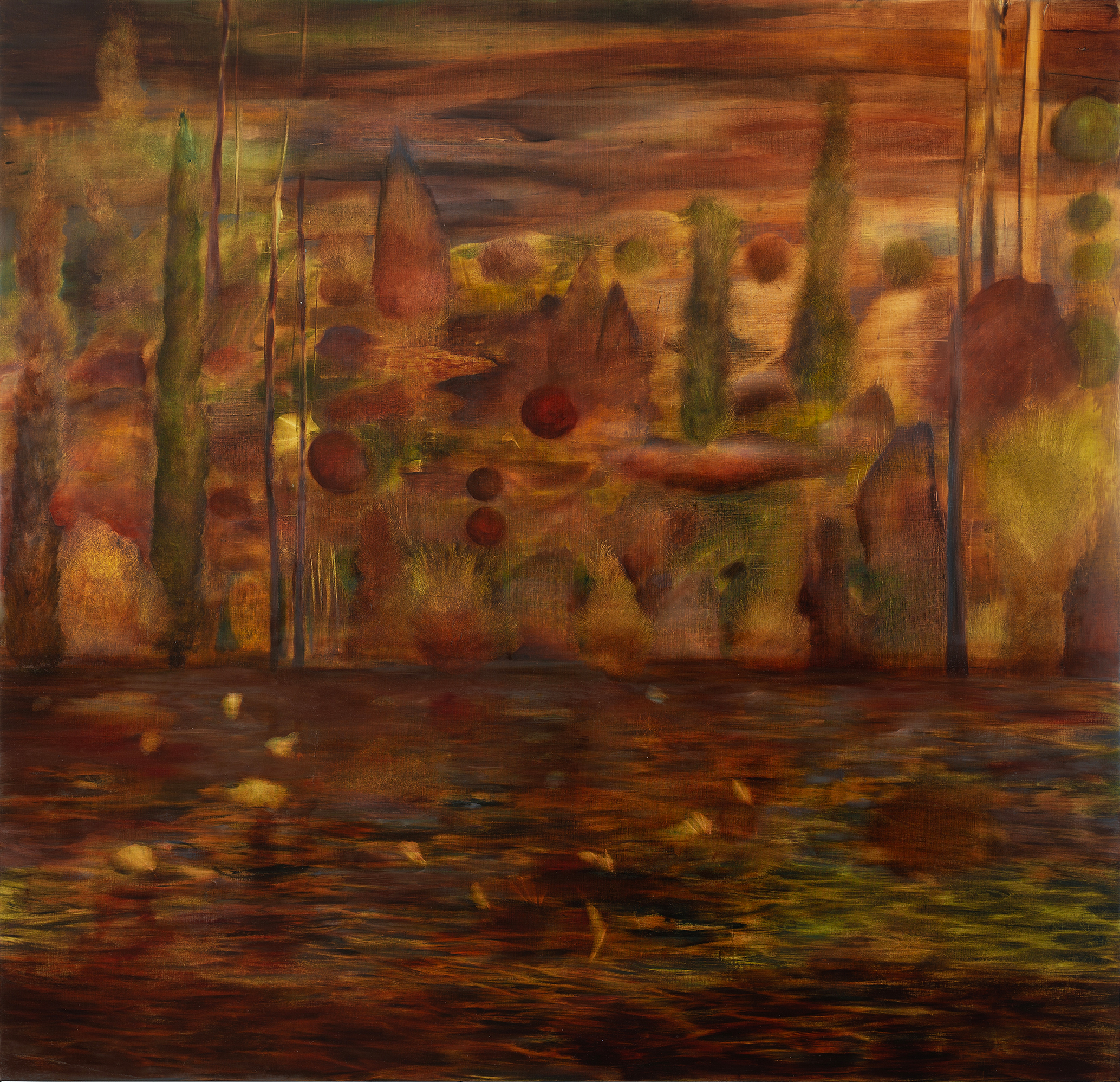 Mysterious abstract qualities of Peckenpaugh’s paintings seem to illuminate a spiritual dimension. In addition to orbs of light, other darker floating forms may resemble a range of objects from rocks, flowers, and fruits to planets or beings. These orbs and forms often appear in the foreground, seeming to rise and come together into an intimate cluster. The undulating textures, interlacing forms, and restless light cause the landscape to appear to move with the eye, as if animated by internal life forces. A spiritual dimension comes in and out of focus, in sharp relief and nebulous veiled forms.