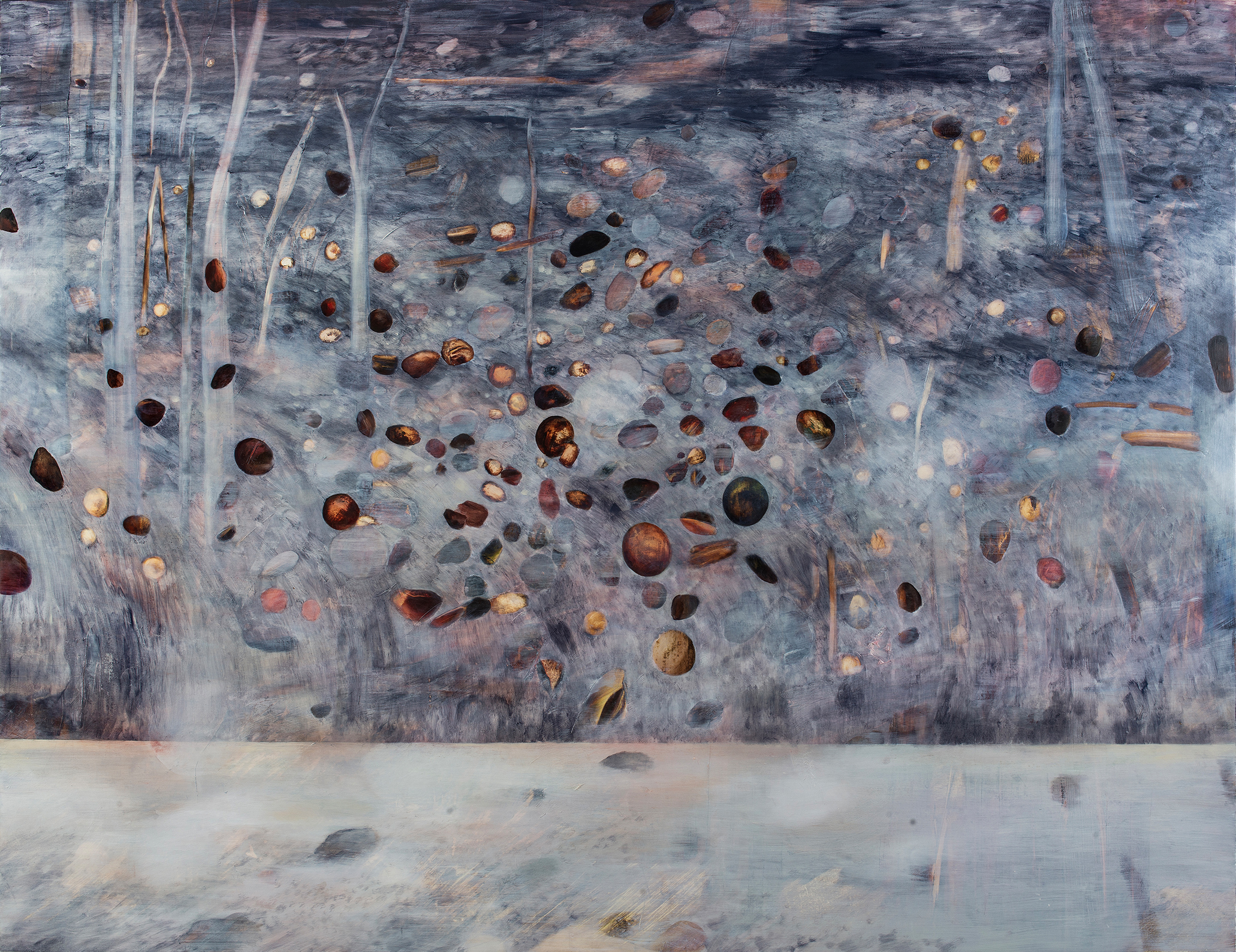 “My material and surface quality informs the narrative of the painting. […] I would go in and mark places of potential shapes that could look like a new shape. So I was doing circles, for example, and they start to turn into rocks.