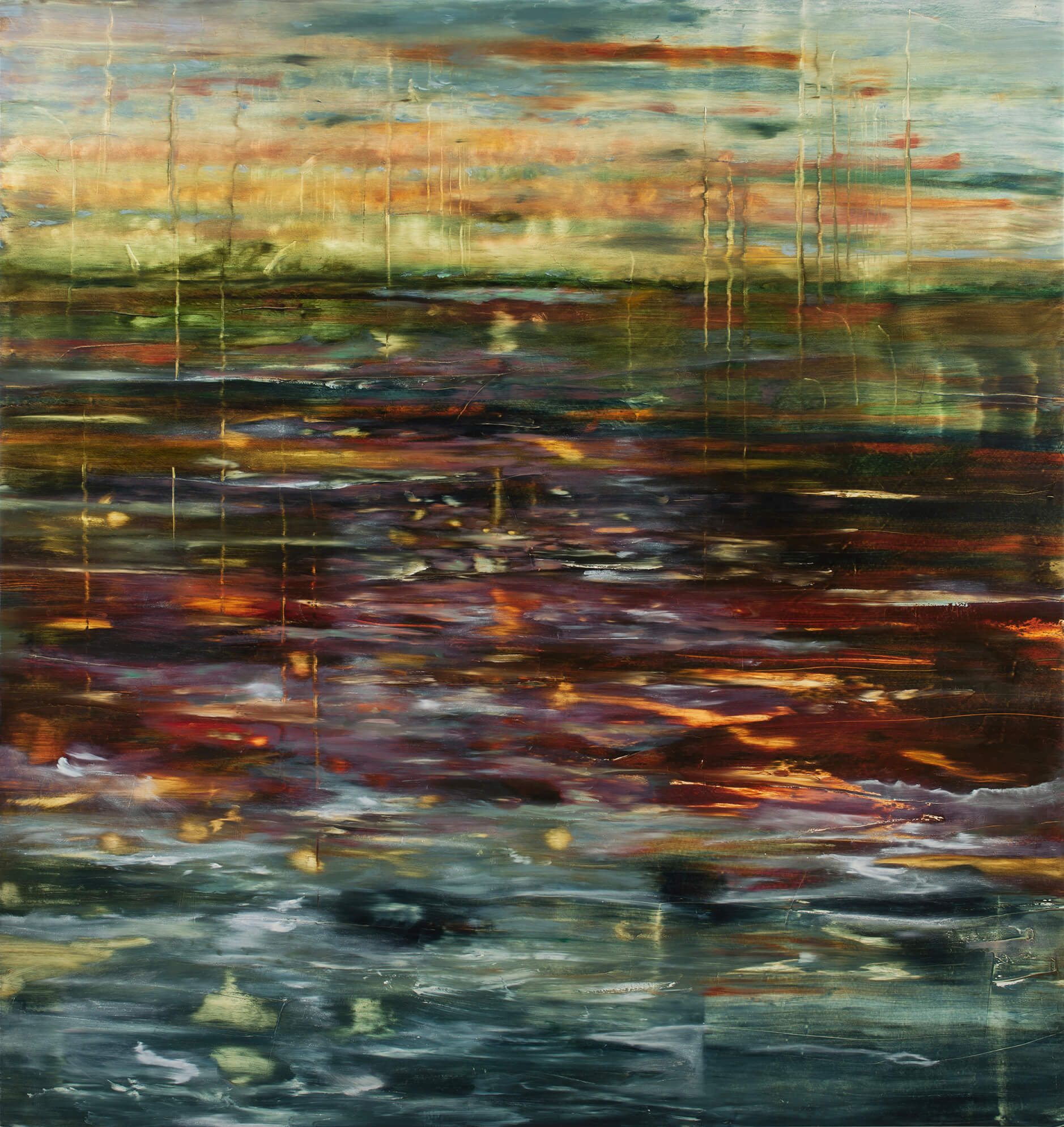 Peckenpaugh lures a viewer in with the semblance of the natural world. She makes her paintings with techniques similar to Gerhard Richter, resulting in comparable interlocking horizontal, diagonal, and/or vertical lines. In her painting Held for instance, horizontal and diagonal forms dominate the composition. Her painting Spring prominently features textured bands of colors in horizontal rows that are interrupted by wavy vertical lines. These undulating lines energize the canvas with motion and imbue the painting with a sense of infinite space, perhaps of a body of water or a lush landscape. Unlike Richter’s approach to layering and removing paint, Peckenpaugh’s gestures are more distinct and resemble organic elements such as reeds, leaves, flowers, trees, and water. In some cases, she uses cutout painted papers to determine where to place hard-edged objects before she paints them. When placed, they create rhythm and generate spontaneity, finding order within disorder. Her refined palettes and forms allow a viewer to almost feel the atmosphere in her paintings—cold and windy in In Orbit, humid and muggy in Held, wet and floral in Betrothal, fresh and rainy in Spring