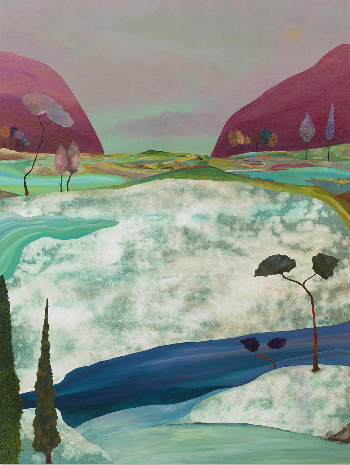 Rolling rocks, hills, mountains, and waterways are delineated with hard edges but filled with a fluid and varied paint application. Texture emerges in Taylor’s paintings from canvas stained with acrylic inks, washes of color mixed with pastel ground, an airbrush, and short, thin brushstrokes. His energetic approach to applying paint imbues the landscape with movement, as the skies are striated or bubbling with clouds, and mountains thrust upwards and plunge downward with dreamlike colors as topographical markings. Even the more gentle scenes generate movement. Take Berceuse, for instance, whose title implies a lullaby. Desert sands roll in the distance, as if slowly kneading the wide open plain in the center, rocking it to rest.