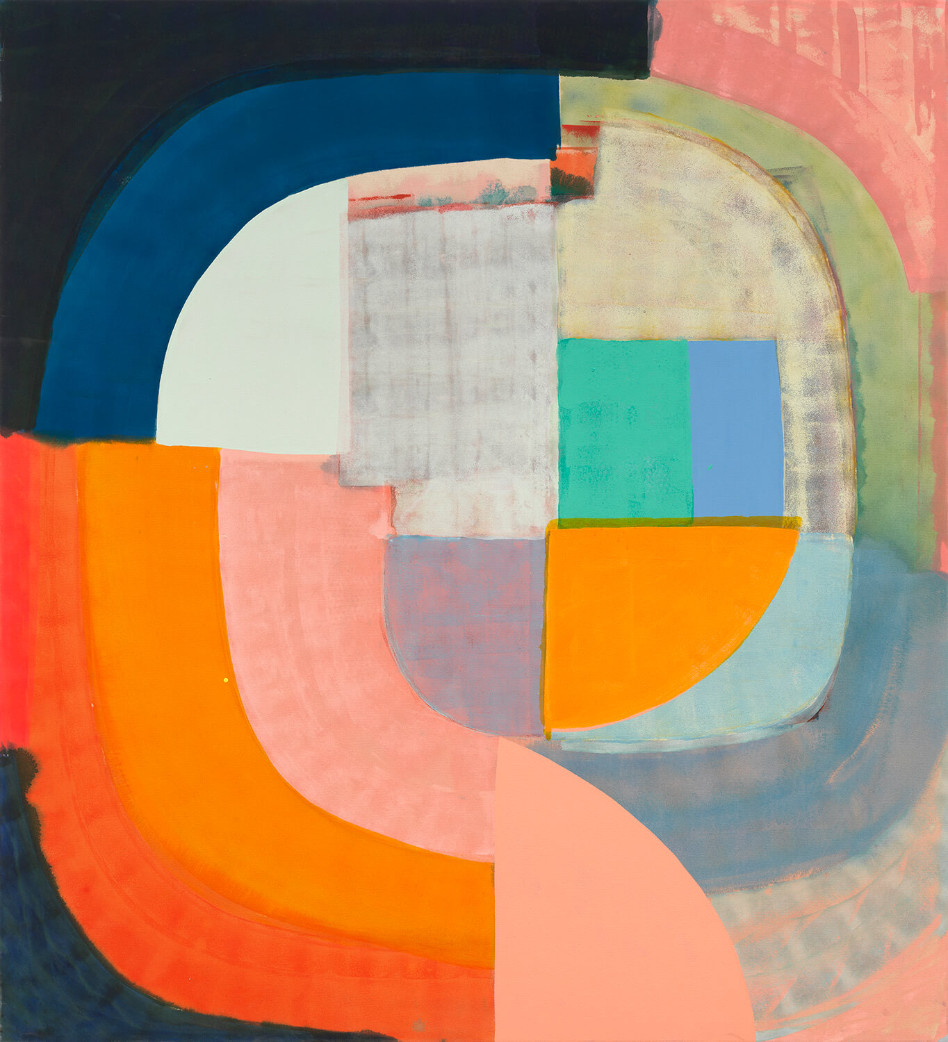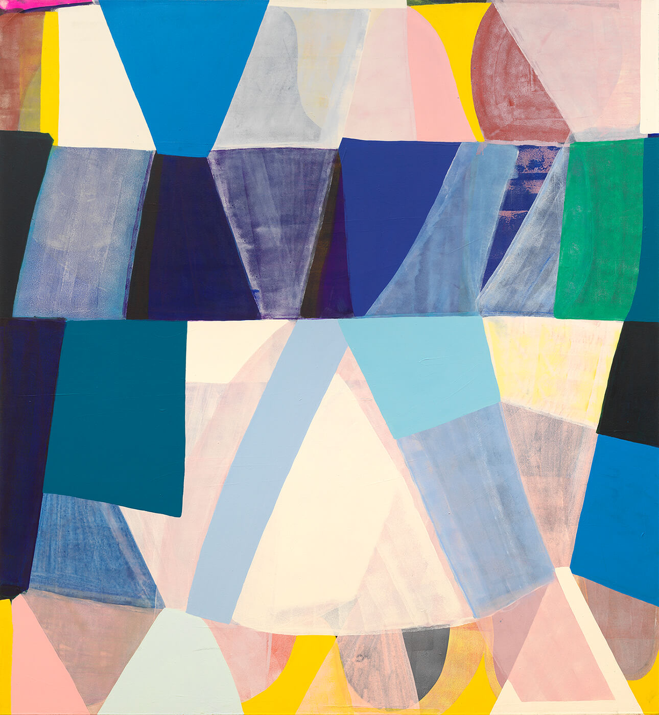 Taylor depicts the unfolding of landforms’ metamorphoses with psychedelic colors, unstable perspectives, and collage-like elements. Through a technique he calls “stitching,” Taylor collages multiple perspectives of a scene, fusing certain elements and allowing others to abruptly halt, to form a new but familiar place. In his stitched paintings—such as Summum and The turning year—vertical lines mark the interference of time into space. Here, the landscape glitches. Waterways flow, dry up, and change color. Land masses emerge and are destroyed in an instant.
