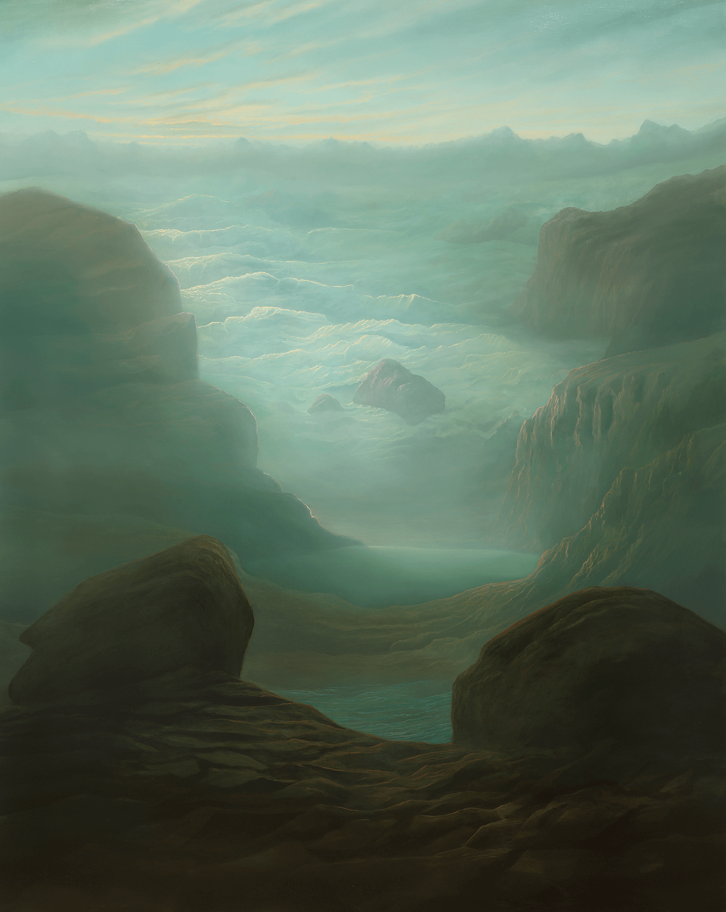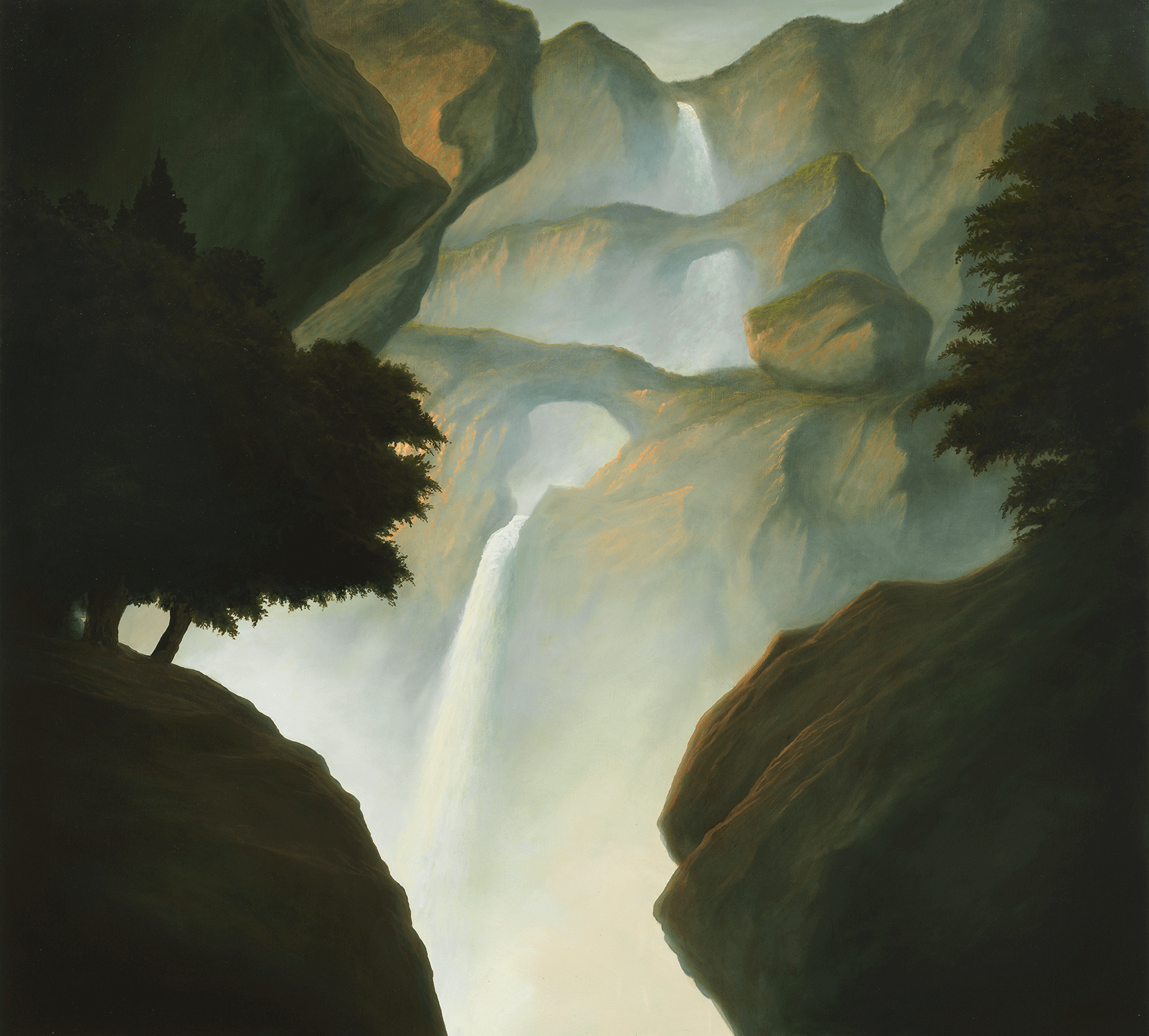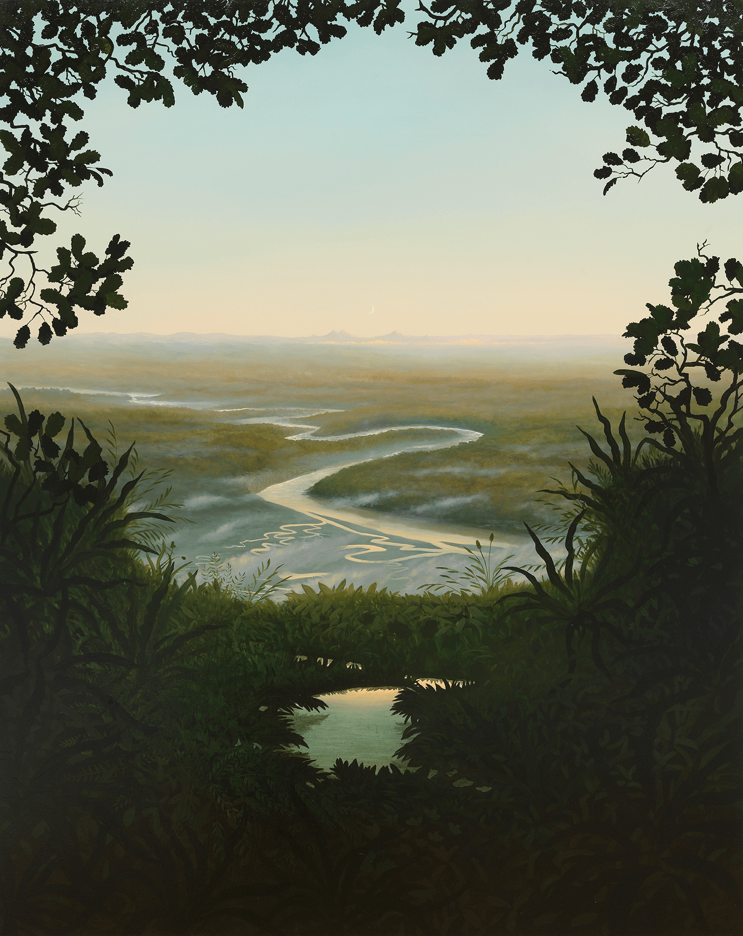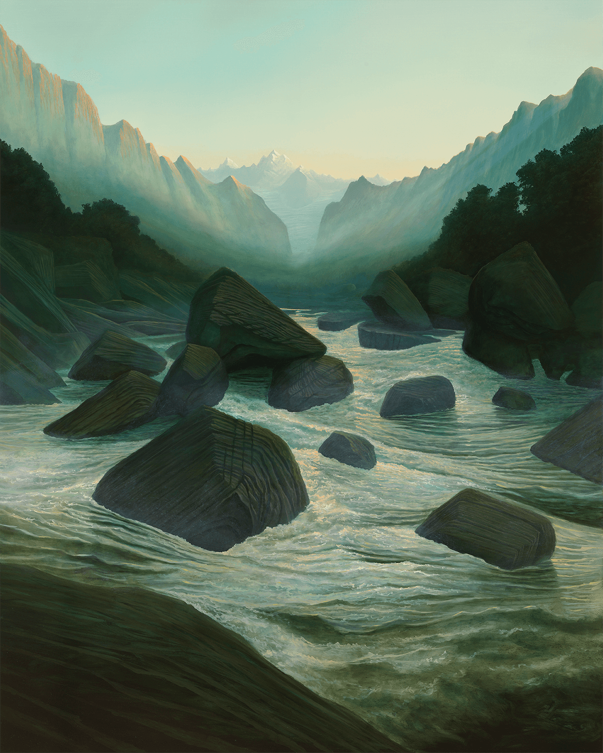 Although the nature depicted resembles familiar real landscapes, they are neither from a specific location nor time. Conjured from a combination of the artist’s lived travels and fantastical fiction, they evoke an atemporality, perhaps from far into the past or future—or Life in deep time, as Blissett aptly titled his previous series. Inspired by the poetic light and allure of Arcadian idylls depicted by artists such as Claude Lorrain and J. M. W. Turner, Blissett’s convincing fluvial mountainscapes are shrouded in misty veils of humidity and water spray. They are composed of meticulous yet also Impressionistic short brushstrokes.