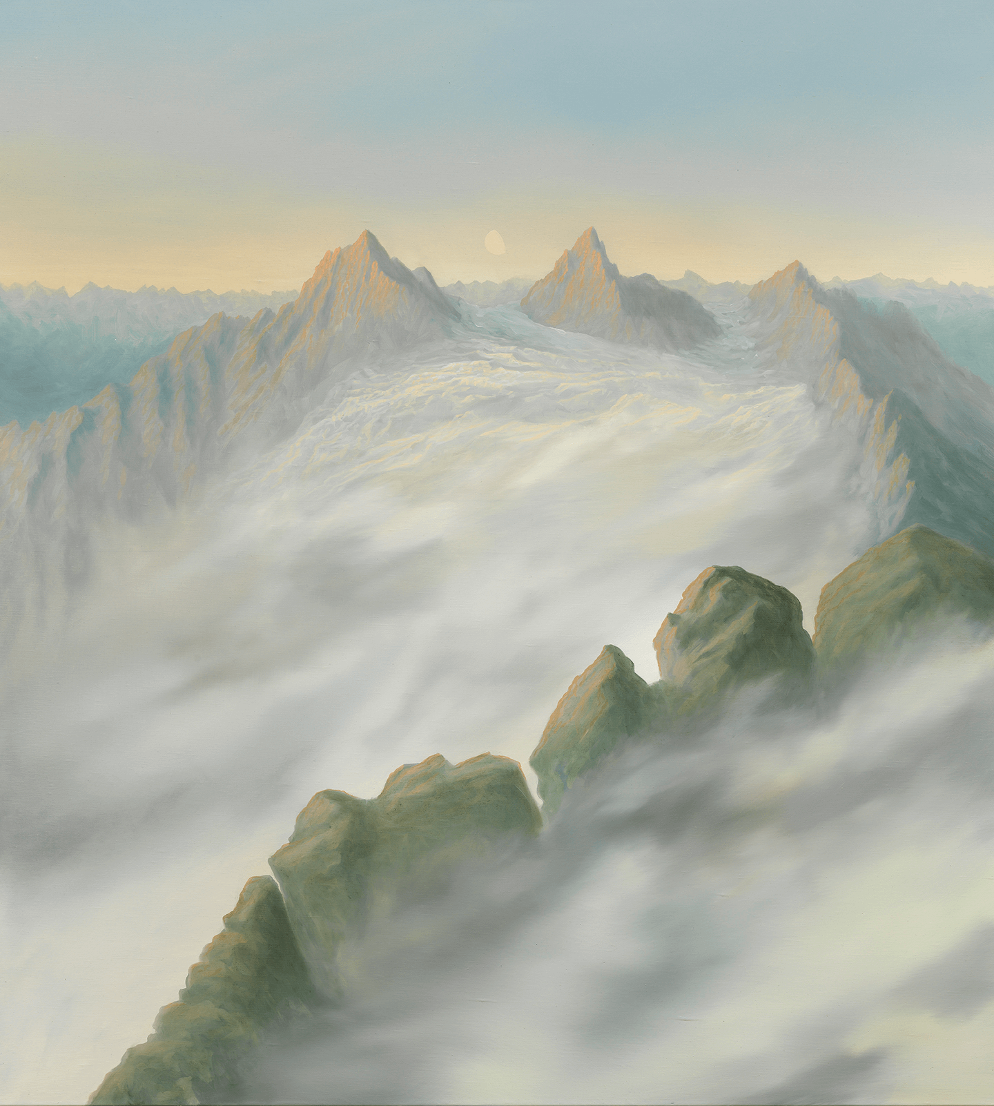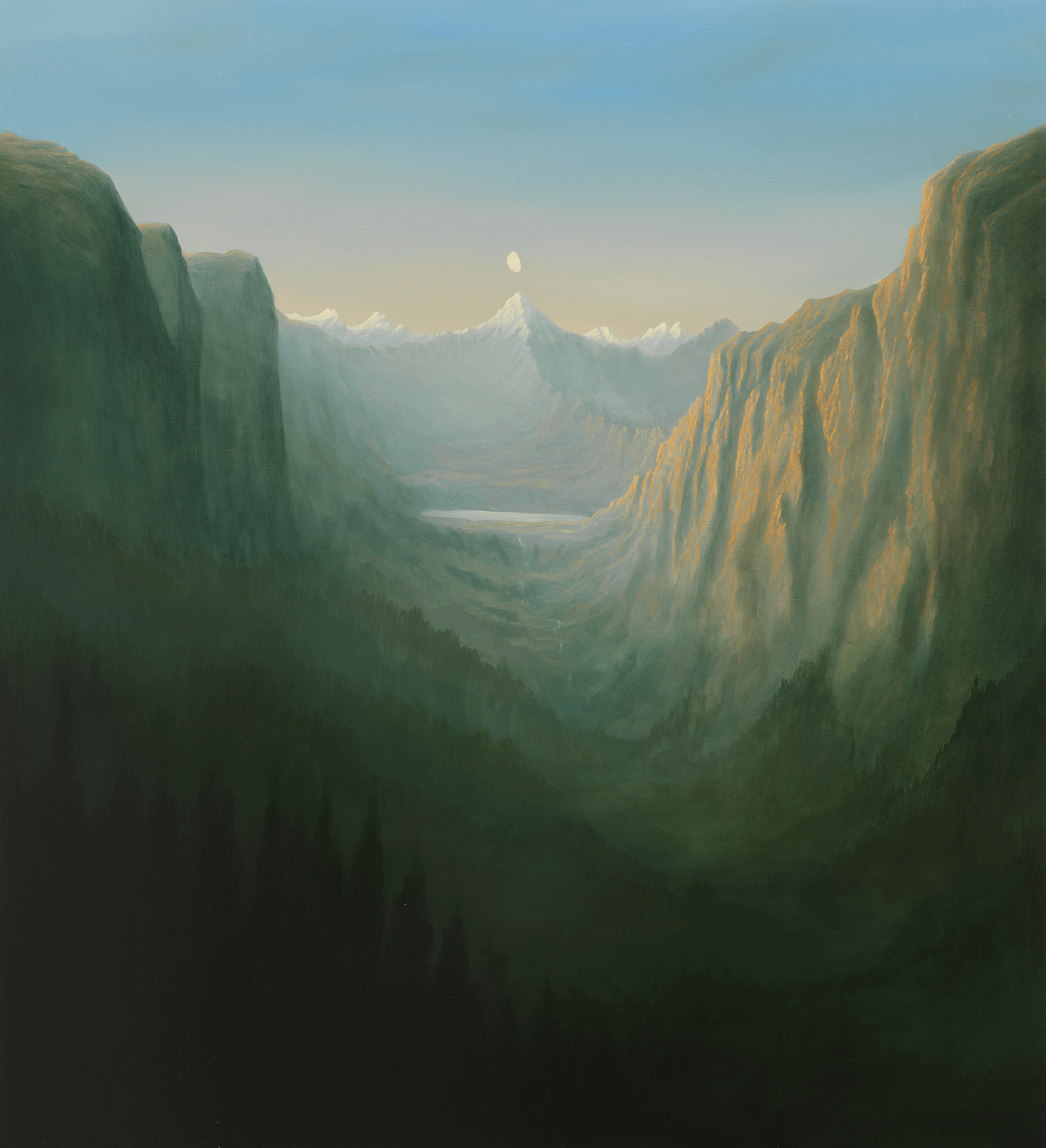 This body of work presents a range of climates and light, some warm as in wanderer or descent, and some cooler as in vortex and sublimation. In most cases, Blissett dramatically employs chiaroscuro contrast by rendering the foreground much darker than than the center of the composition. The foreground is often used to disrupt the almost perfectly symmetrical composition. Here, a viewer is often placed on an angular patch of land or rock at one of the lower registers of the canvas. In other cases, the symmetrical order is interrupted by a body of water flowing from one side of the canvas to the other. Further, two of the paintings in this show sublimation and furrowed portray a waxing gibbous moon just above the mountain peaks, mimicking the artist’s theory of near-perfect symmetry and gesturing towards the cycle of life. Much like the contradictory nature of water and the title of this show, though the paintings present a harmonious order and peaceful landscapes, they also depict the wild turbulence of water.