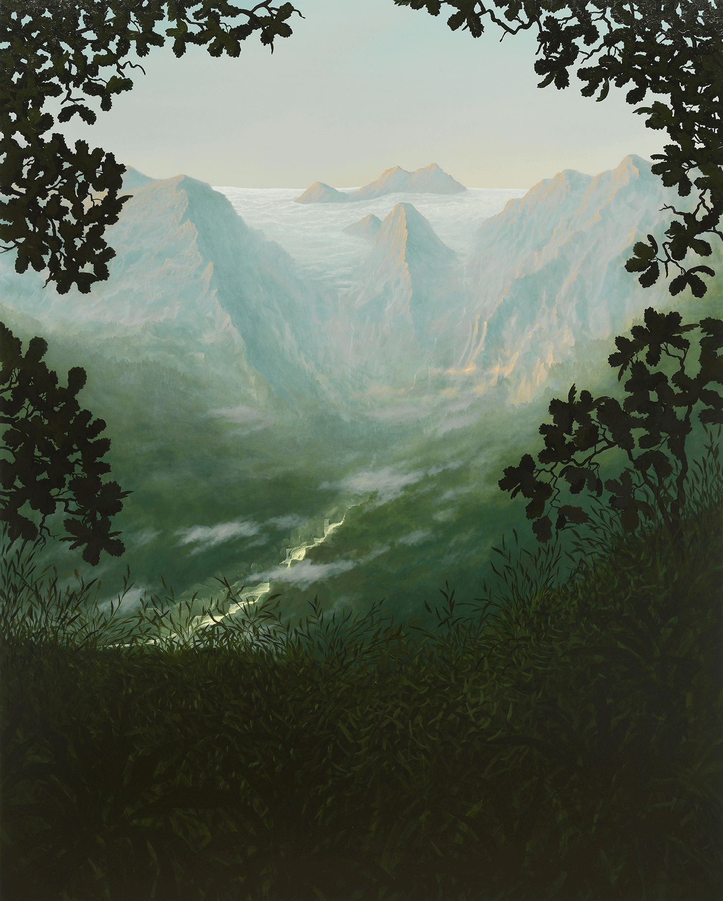 In The white heat of cold water, Blissett depicts nature’s sculptor in action: flowing and frozen water. Water is sacred in the paintings, as it is in many religions and belief systems. These scenes depict the erosion of land by water and ice. In the artist’s words, here, “as in the world, water is not a passive component of the landscape but rather the active architect of a landscape.” With a background in geography, the artist chose landforms that are the product of cold water’s force: deep u-shaped valleys, sculpted cave mouths, open plains, cavernous gorges, and rock arches. Alongside them are plants that are dependent on water, carrying, in the artist’s poetic words, “rivers of sap within them.”